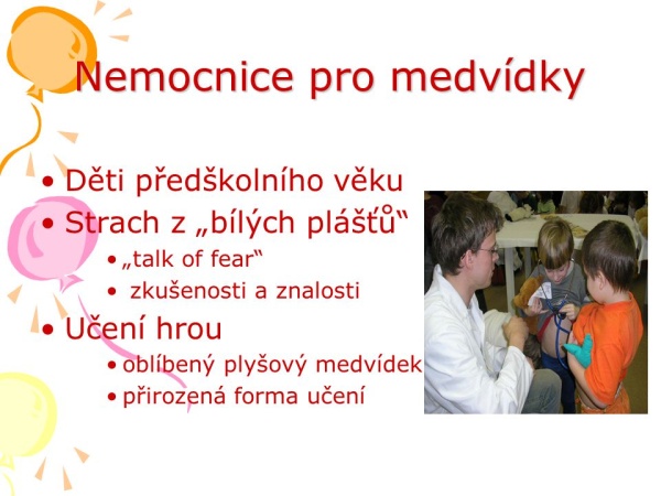 Prostřednictvím této aktivity se snažíme zbavit děti strachu z bílých plášťů, seznámit je prostřednictvím plyšového medvídka a jiných hraček s lidskými orgány a zdravotnickým prostředím.
