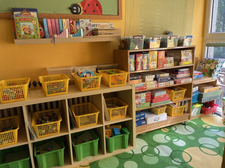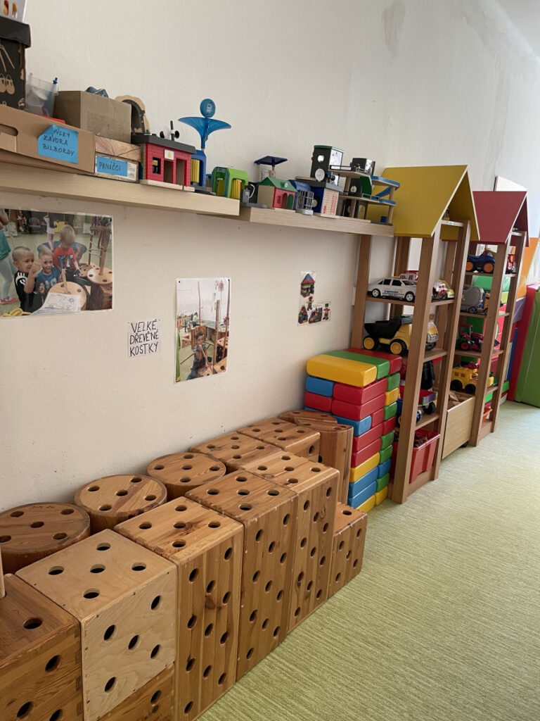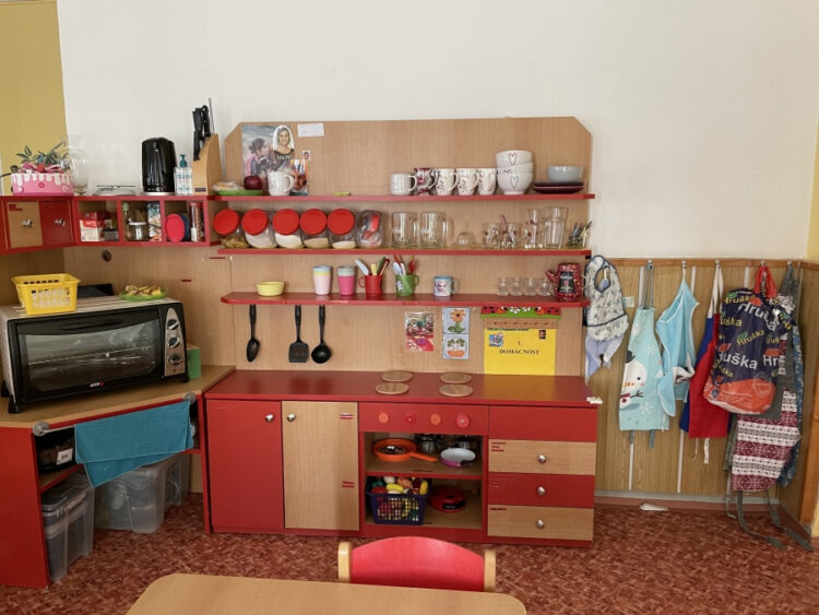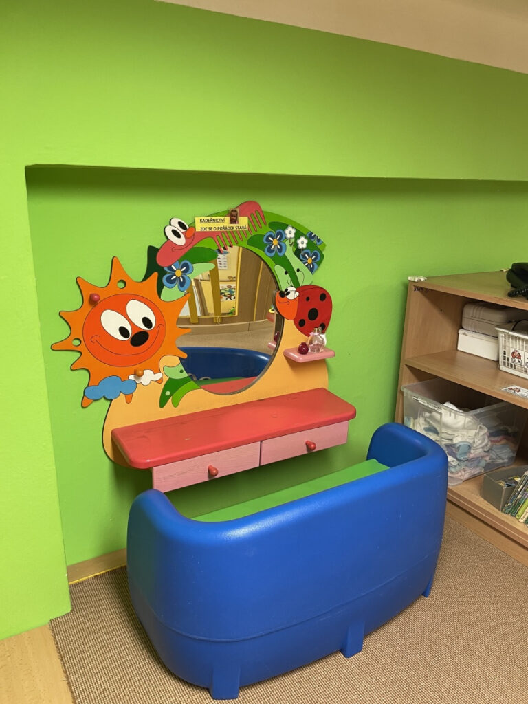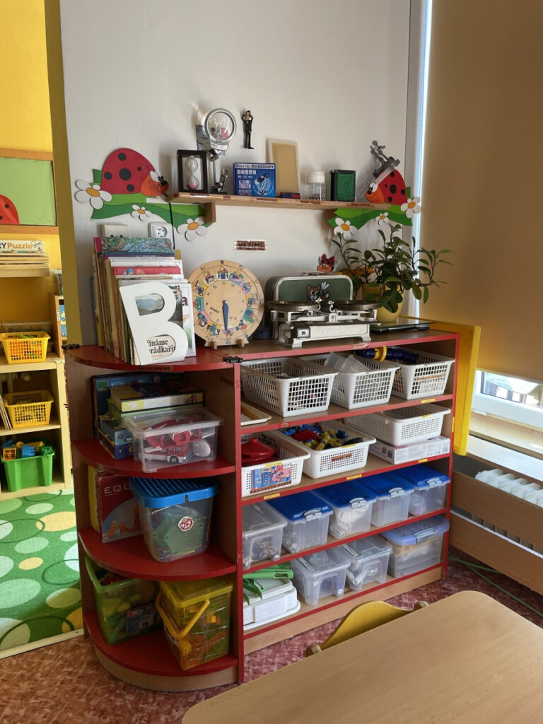 Třída má hernu pro stolní a manipulační hry, hernu s kostkami a vestavěnou kuchyňku s patrem, obchůdek, divadlo. Velmi se nám osvědčily ranní úkoly s rodiči – rodiče se seznamují s činnostmi dětí ve školce,