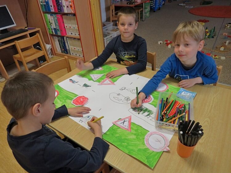 Duben – měsíc bezpečnosti. Tak jsme se spolu zaměřili na dopravu, dopravní prostředky i dopravní značky, víme, kde se pohybují a na jaká světla reagují. Auta jezdí po silnici, vlak…