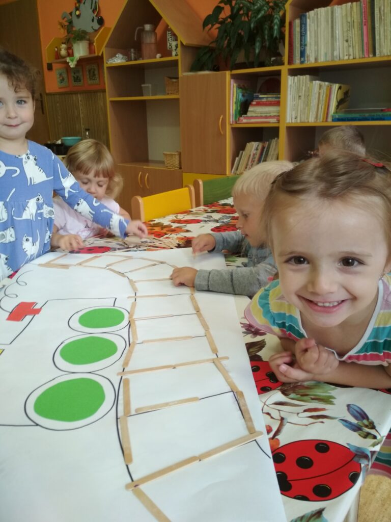 Sešli jsme se v plné síle, nezažili nudné chvíle. Navštívil nás Pat a Mat, náš plyšový kamarád. Postavili jsme si školku svou, o bezpečnosti v dopravě učili se hrou. Indiánům…