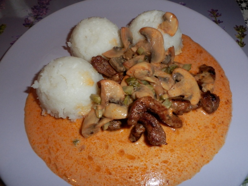 Ingredience: 500g telecího masa 200g žampionů 2 ks cibule 2 dcl bílého vína (vynechali jsme) 2 dcl smetany hl.mouka, citr.šťáva, tymián, pepř, petrž.nať Postup:…