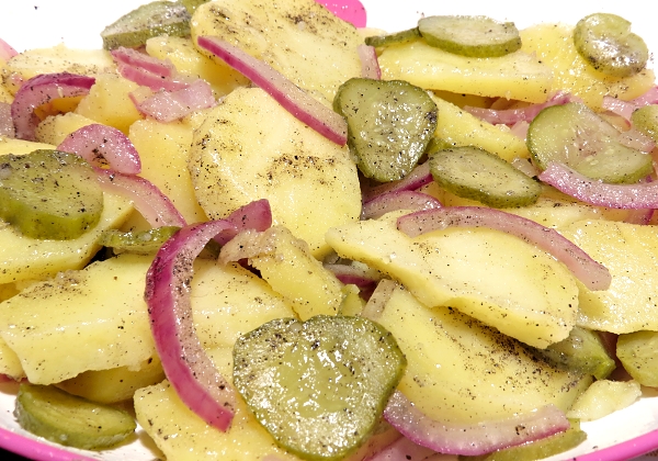 Ingredience: 1 kg menších salátových brambor 6 ks okurek naložených ve sladkokyselém nálevu Na zálivku: 2 ks červené cibule 2 dcl nálevu z okurek…