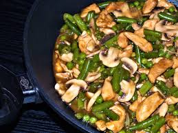 KUŘECÍ MASO SE ZELENÝMI FAZOLKAMI A ŽAMPIONY