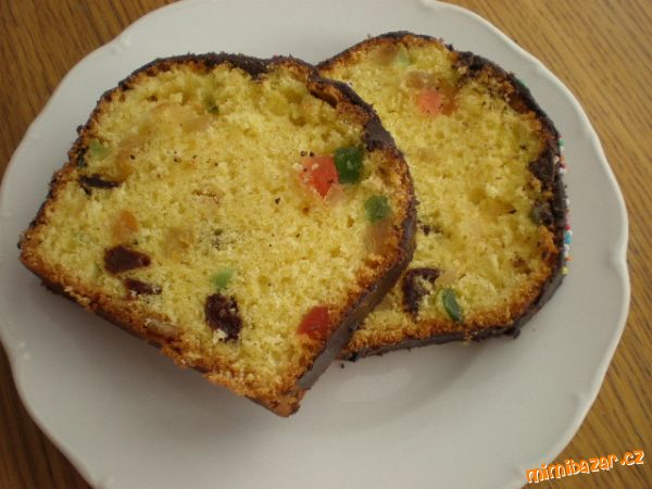 Ingredience: 270 g hl.mouky 150 g másla 110 g cukru 5 vajec 1 prášek do pečiva kandované ovoce, rozinky …