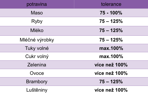 Přehled sledovaných potravin a jejich tolerance plnění dle vyhlášky: